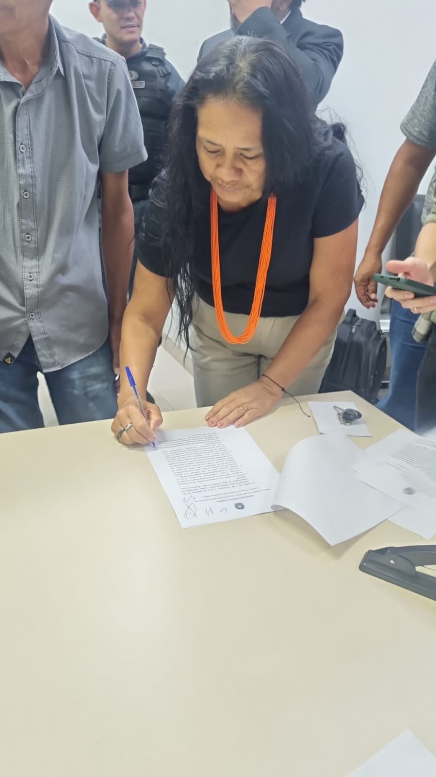 Confira o momento em que os indígenas assinam o documento: