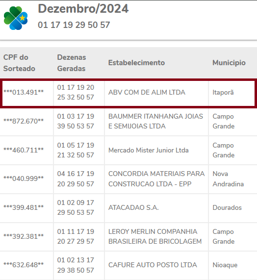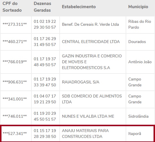 A nota premiada MS realiza todos os meses sorteios, e participam as pessoas que cadastraram o CPF durante as suas compras. No sorteio do mês de Dezembro o município de Itaporã teve 3 ganhadores, sendo que um efetuou sua compra na empresa (Construita) com a razão social Anaju Materiais para Construção LTDA, e outros dois compraram no Mercado ABV.
