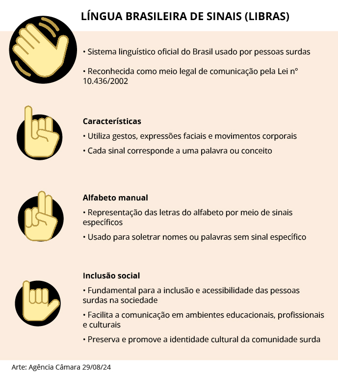 A Comissão de Defesa dos Direitos das Pessoas com Deficiência da Câmara dos Deputados aprovou projeto de lei que obriga a presença de intérprete de Língua Brasileira de Sinais (Libras) para atuar na comunicação com turistas surdos ou com deficiência auditiva em locais turísticos públicos. A proposta também prevê a oferta de tecnologias assistivas, como sistemas de alerta visual, legendas em vídeos e aplicativos.