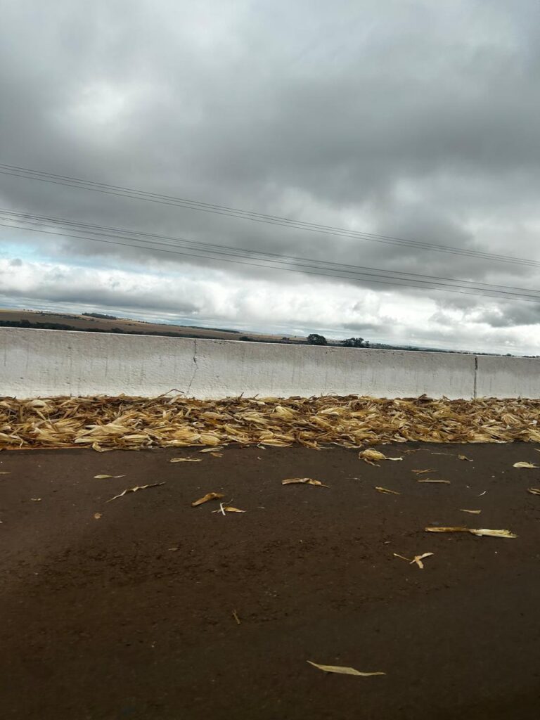 A situação chama atenção e ao mesmo tempo é um alerta às pessoas que trafegam pelo local, caso não seja limpo, em breve essa palha irá se espalhar por toda a pista, sendo necessário ter cautela ao passar pela rodovia.