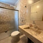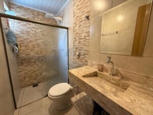 - Banheiro com acabamento em pedra de mármore e box de vidro