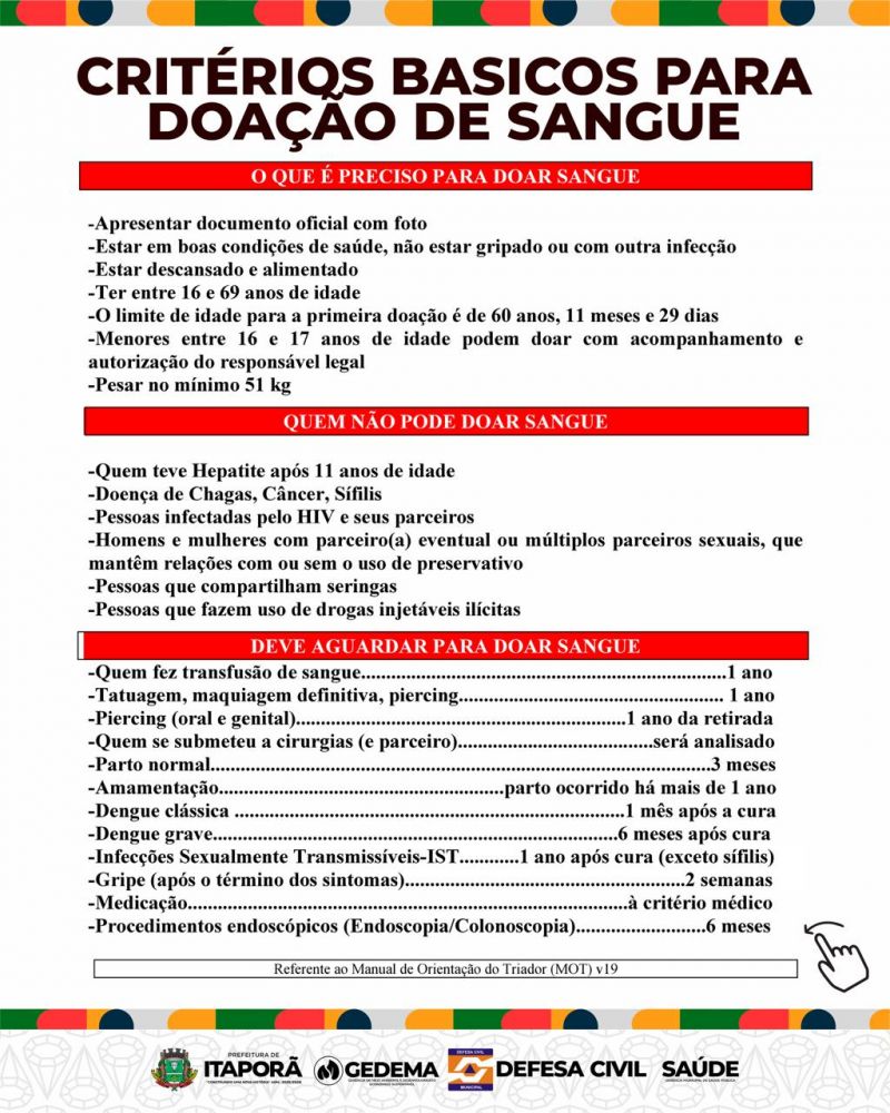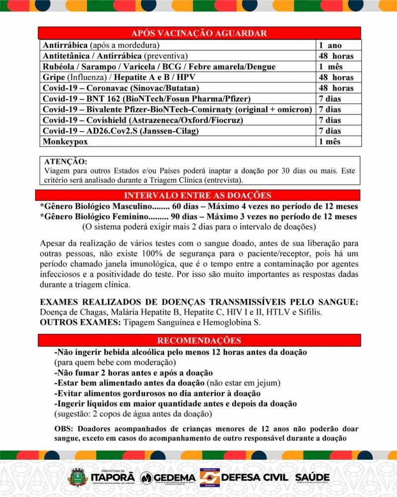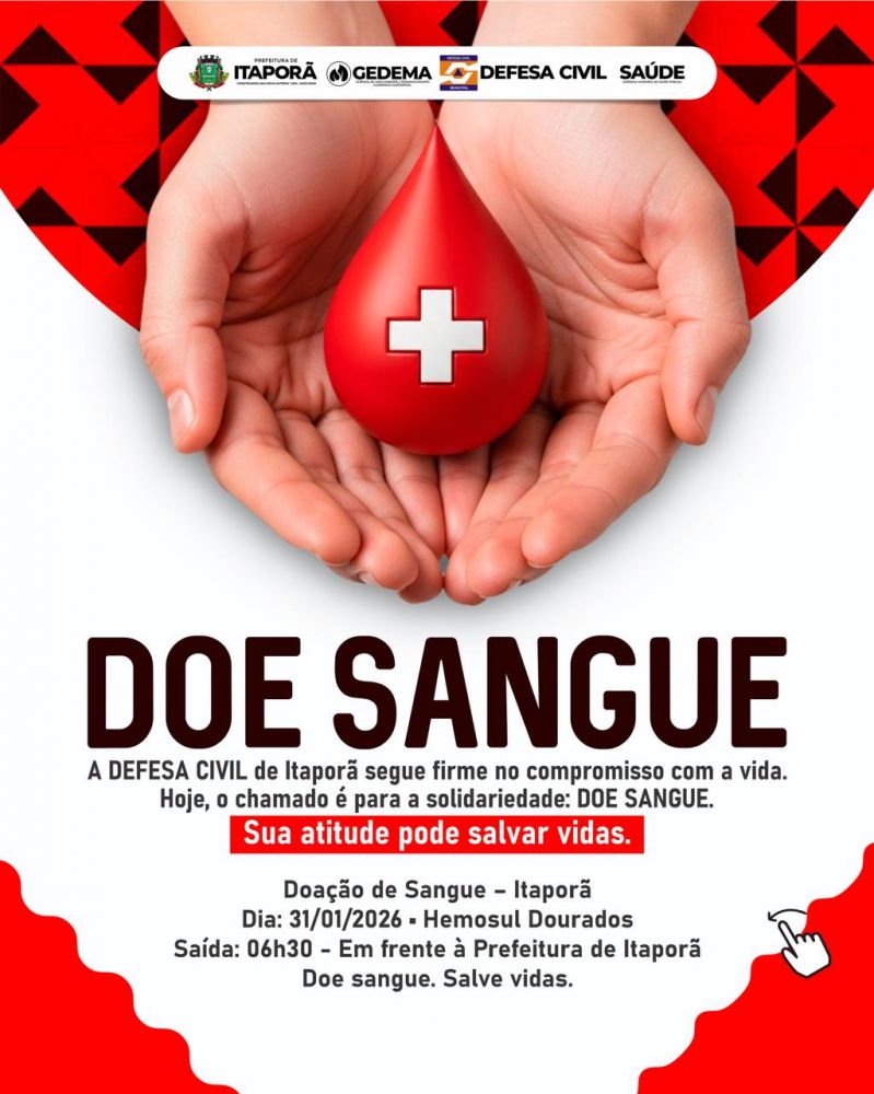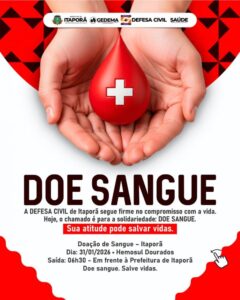 A GEDEMA, por meio da Defesa Civil de Itaporã, em parceria com a Gerência de Saúde Pública, promove no próximo dia 31 de janeiro de 2026 uma importante ação solidária de doação de sangue, com destino ao Hemosul de Dourados. A iniciativa reforça o compromisso do município com a preservação da vida e o fortalecimento da rede de saúde regional.
