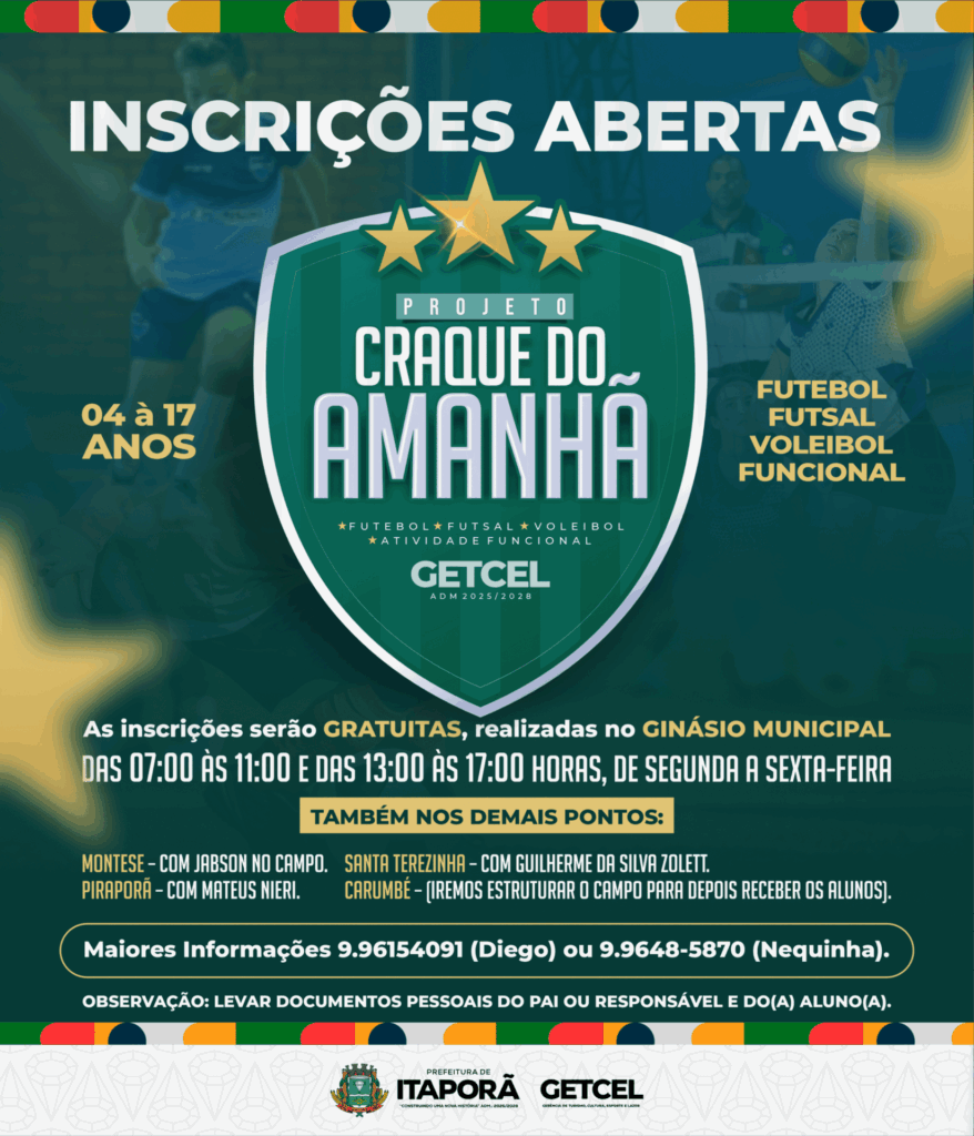 Estão abertas as inscrições para o Projeto Craque do Amanhã, iniciativa desenvolvida pela Prefeitura de Itaporã, por meio da Gerência de Esporte, Turismo, Cultura e Lazer (GETCEL), com o objetivo de incentivar a prática esportiva e promover o desenvolvimento social de crianças e adolescentes no município.