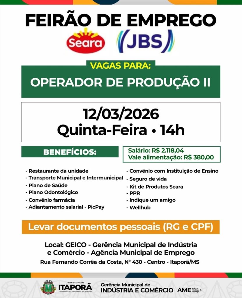 A Prefeitura de Itaporã, por meio da Gerência Municipal de Indústria e Comércio (GEICO) e da Agência Municipal de Emprego (AME), promove nesta quinta-feira, 12 de março, um Feirão de Emprego em parceria com as empresas Seara e JBS.